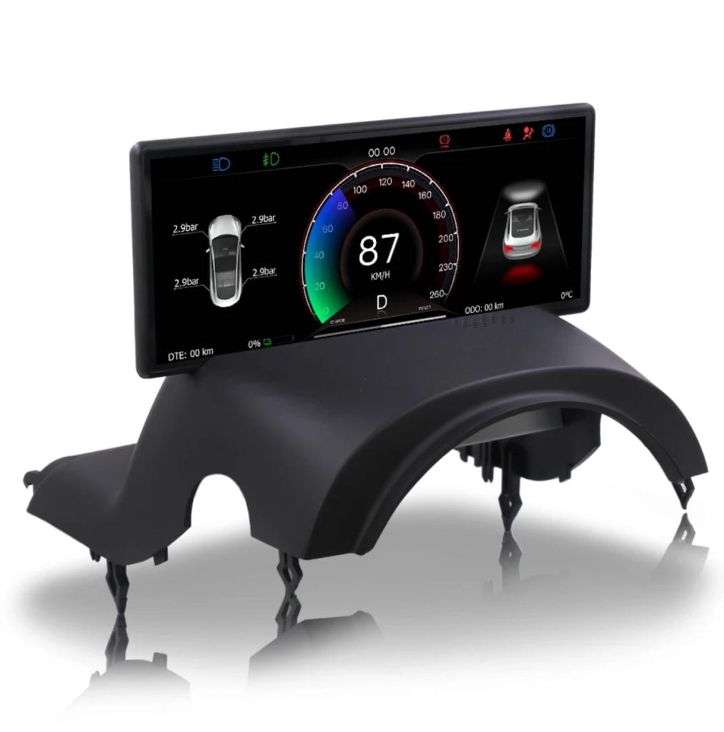 Σχεδιασμένη να ταιριάζει άψογα με το εσωτερικό των Tesla Model Y και Model 3, η οθόνη αυτή τοποθετείται μπροστά από το τιμόνι και εμφανίζει βασικές πληροφορίες, όπως η ταχύτητα, η κατανάλωση ενέργειας, η απόσταση ταξιδιού, και η αυτονομία της μπαταρίας. Επιπλέον, περιλαμβάνει ενδείξεις για το σύστημα υποβοήθησης οδήγησης, όπως το Autopilot, και προσφέρει ειδοποιήσεις για τις τυφλές γωνίες (blind spot assist), αυξάνοντας την ασφάλεια κατά την αλλαγή λωρίδων.